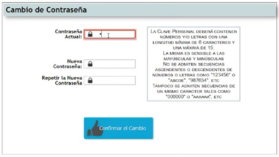 Allí deberá ingresarse la contraseña actual, para seguidamente ingresar y repetir la nueva contraseña.